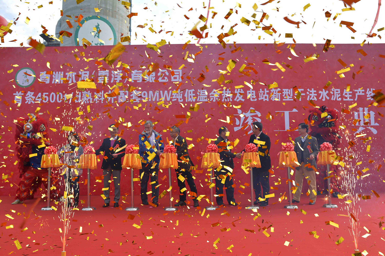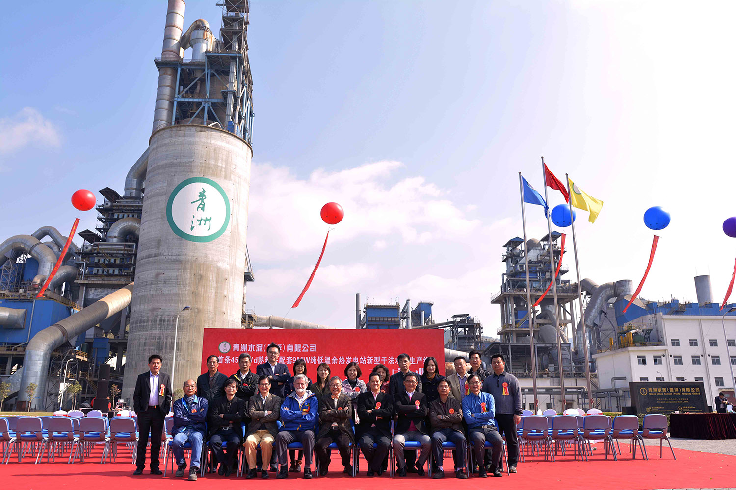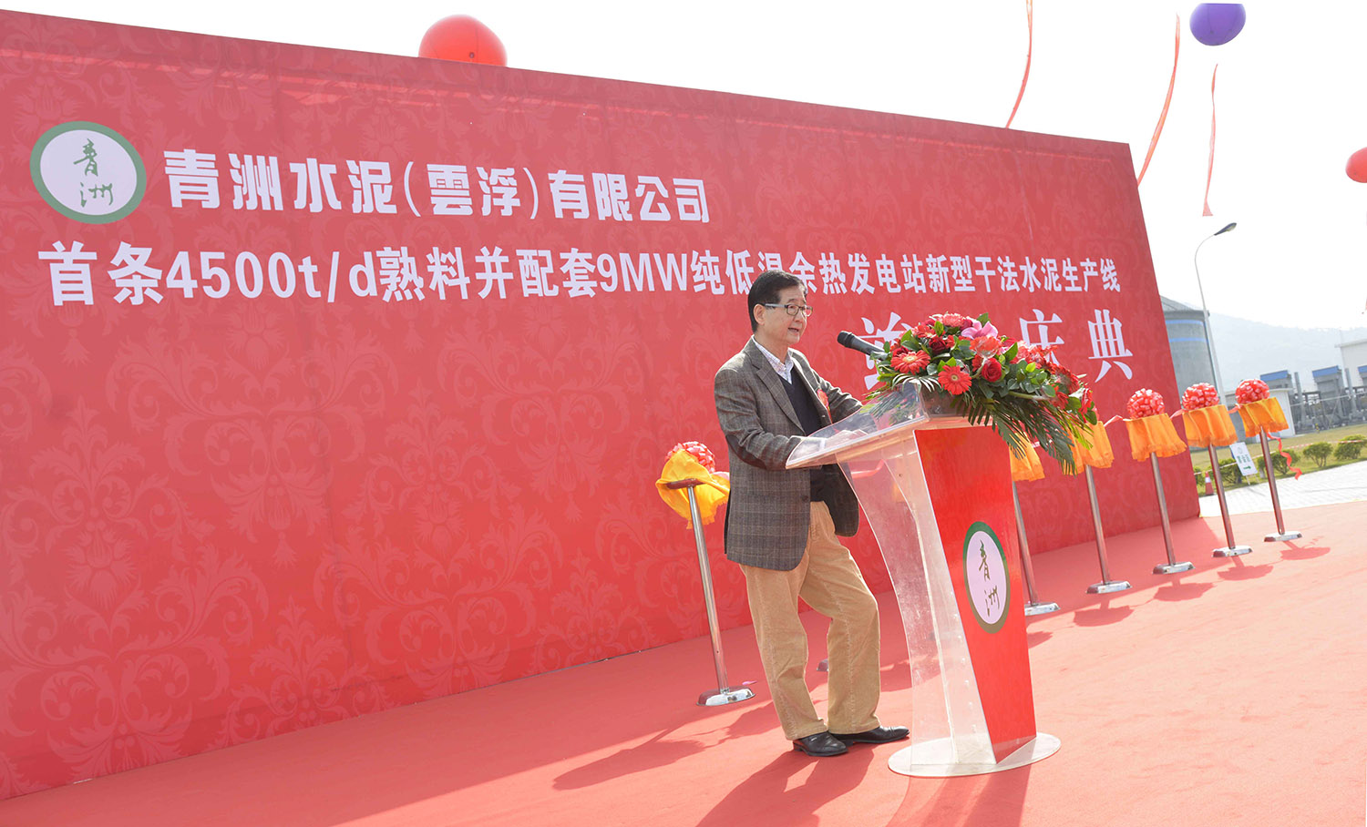 12月12日上午,乾坤大地风和日丽,阳光普照,青洲水泥(云浮)有限公司在厂区隆重举行首条4500t/d熟料并配套9MW纯低温余热发电站水泥生产线竣工庆典活动!现场客会聚欢声笑语,蓝天白云彩旗飘扬,醒狮飞舞鼓乐喧天,到处洋溢着欢乐祥和的气氛。云安区委书记、区人大常委会主任黄泽寰先生,云浮市国土资源局副局长杨昌明先生,云安区人大副主任潘镜兴先生、区委常委吴汉昌先生、副区长钟斯权先生等领导,以及云浮市、云安区相关部门和地方领导到场祝贺。集团公司行政总裁梁英华先生、青洲水泥集团执行董事庄善敦先生、曾百中先生、集团国内水泥业务总经理林俊标先生、青洲英坭有限公司董事陈启鸿先生、集团香港水泥业务总经理蔡家强先生、集团财务总经理吴美玉小姐、集团国内业务财务总经理梁富强先生,广信青洲矿务部总经理何建荣先生等出席庆典仪式。参加庆典仪式的还有天津水泥设计院总经理韩长凯先生、河北建工集团董事长李云霄先生、苏州中材建设有限公司董事杨贤贵先生、云浮市第二建筑有限公司总经理徐永强先生、大连易世达新能源发展股份有限公司总裁何启贤先生、湖北时代监理工程有限公司总经理刘强先生,以及青洲公司管理层和各部门代表、上述单位的各级领导和代表。