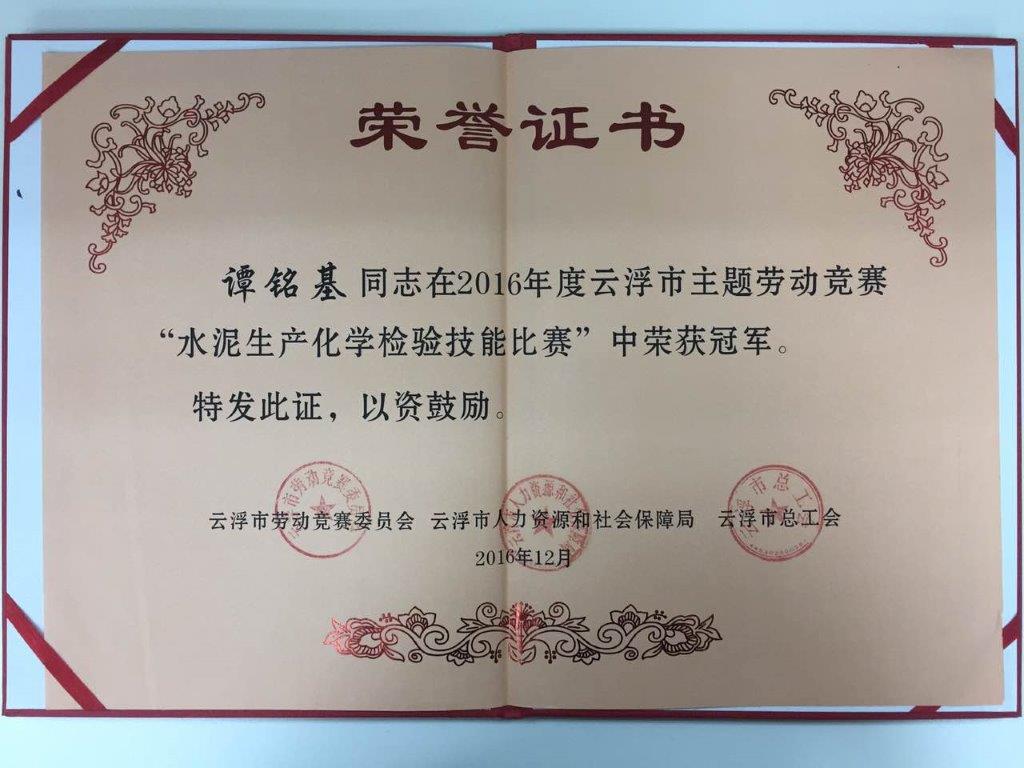 由云浮市劳动竞赛委员会、市人力资源和社会保障局、市总工会主办,云安区总工会协办的"践行新理念 建功十三五"2016年度云浮市主题劳动竞赛项目——水泥生产化学检验技能比赛,于8月10日下午在中材亨达水泥有限公司中心化验室顺利举行。参赛单位包括青洲水泥(云浮)有限公司、广东广信青洲水泥有限公司、中材天山水泥有限公司、中材亨达水泥有限公司、中材亨达水泥有限公司郁南分公司、中材罗定水泥有限公司。最终,青洲水泥(云浮)有限公司谭铭基和广东广信青洲水泥有限公司刘国冰,凭借出色的检验技能分别获得本次比赛第一、二名。本次比赛在8月14日晚20:00云浮市电视台新闻综合频道《时政新闻》节目中播出,比赛简讯刊登于8月12日《云浮日报》中。