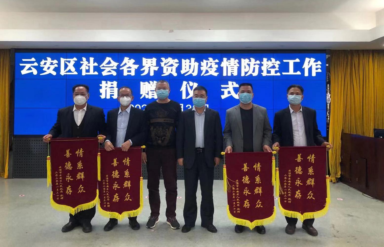 2020年1月30日下午,云安区政府在区会议中心第三会议室举行“社会各界资助云安区疫情防控工作捐赠仪式”,区委书记李军晓,区委副书记、区长谢子超等领导出席并主持仪式,我司委派生产运作总经理兼董事总经理助理蔡和先生出席,仪式上接受了21名企业代表及热心人士捐赠的善款和物资,回赠锦旗及与捐赠代表合影留念。